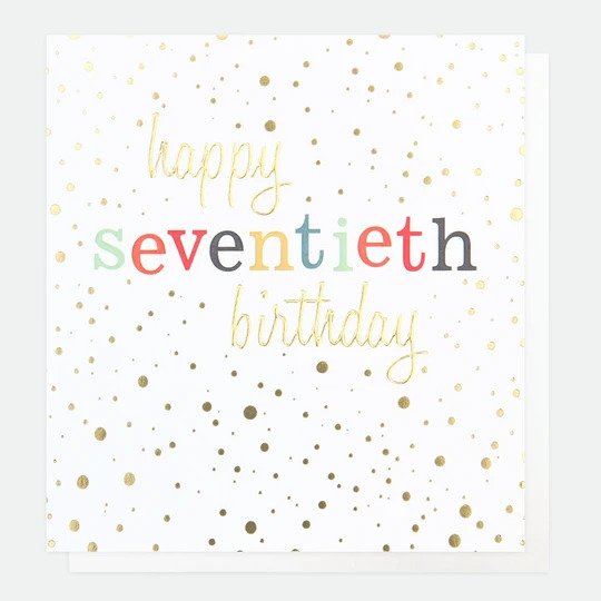 The new spotty age range from Caroline Gardner, Confetti, is adorned with gold foil and embossed colourful captions. This card has been printed on board using a low chlorine pulp from sustainable forests and can be recycled.
