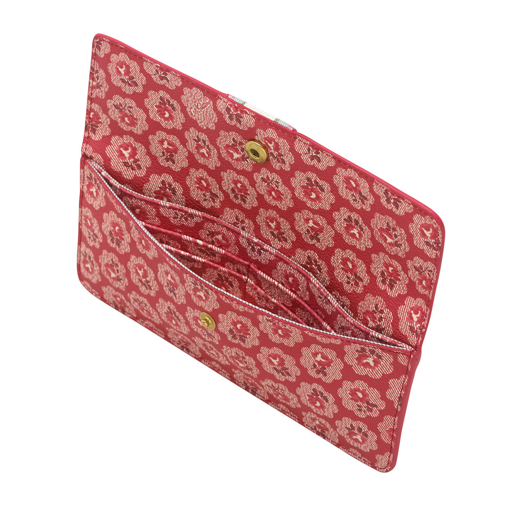 The Freston range takes favourite prints from the archive and breathes new life into them on chic accessories. This large purse in Freston red boasts multiple sections and is finished with a colourful stripe trim and gold button detail.
