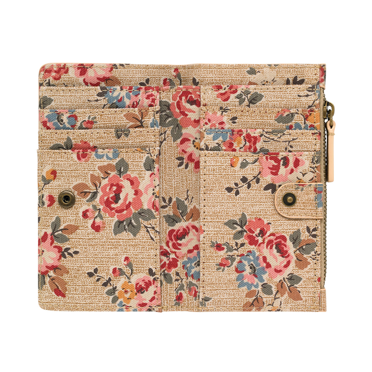 This small book wallet poppers opens to reveal a wealth of slots for cards and cash, printed to match the Kingswood Rose tan exterior, which in turn has a large zipped section for coins.