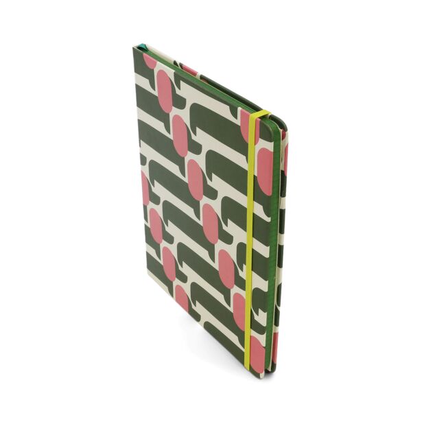 This notebook has a hardcover with rounded corners, an elastic closure and matching ribbon bookmark.