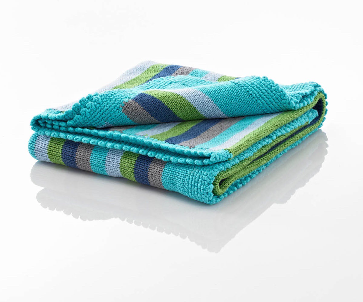 A perfect stripy blue cotton knitted baby blanket for your little one to snuggle under. Handmade and fairtrade