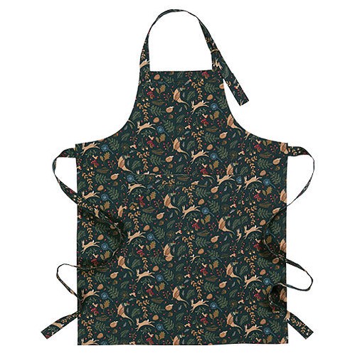 Apron woven in 100% cotton in a Enchanted Forest  print.  Generously sized with adjustable neck tie and long waist ties that can be crossed at the back and tied at the front. Large patch pockets.